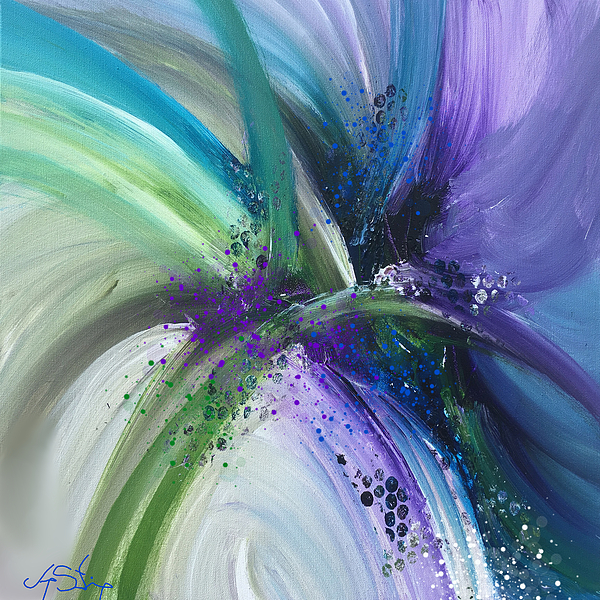 Dynamic swirls of green, blue, and purple create a vibrant, abstract composition with energetic brushstrokes and splatters. The interplay of colors forms a focal point at the center, suggesting movement and depth.