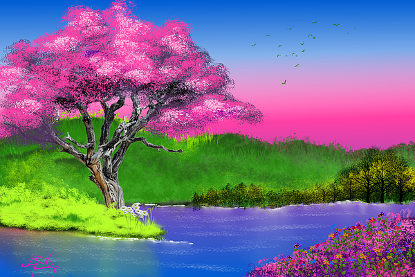 A vibrant landscape features a striking tree with vivid pink foliage beside a tranquil lake. The sky transitions from bright blue to a warm pink hue, complementing the lush greenery and distant birds.