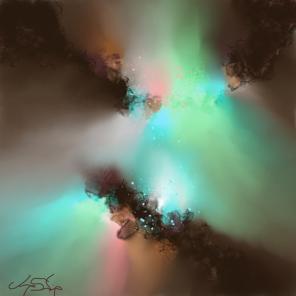 A vibrant display of light and color features swirling blues, greens, and pinks with soft edges and dark contrasting elements. The composition gives a sense of depth and movement, evoking a cosmic or underwater scene.