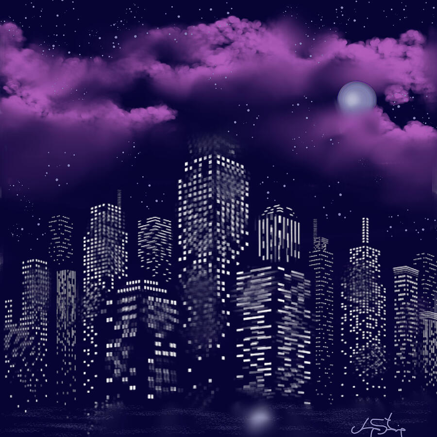 A vibrant city skyline is set against a night sky filled with purple clouds and a bright moon. The buildings are illuminated with numerous windows, creating a lively atmosphere.