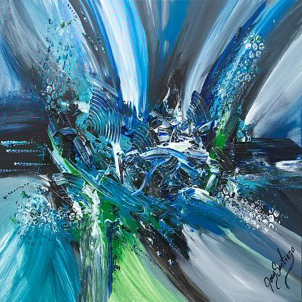 Oceanic Whispers Abstract Art Print - A burst of blue and green swirls form an abstract, dynamic composition, creating a sense of motion and energy. Textured layers and circular patterns add depth and complexity to the fluid design.