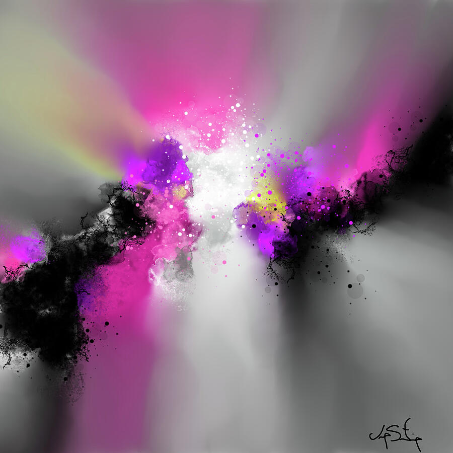 Vibrant splashes of pink, purple, and yellow emerge from a swirling black and gray backdrop, creating a dynamic and energetic composition. Light emanates from the center, enhancing the contrast and adding depth.