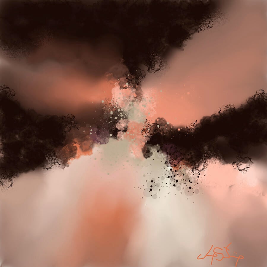 A swirling mix of dark and light tones creates a dramatic, cloud-like pattern across the canvas, blending shades of brown, pink, and white. Soft textures and splatters add an element of chaos and movement to the composition.