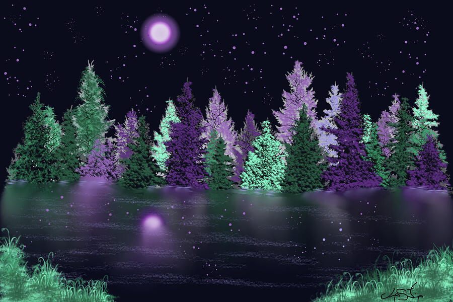 A serene nighttime scene features a tranquil forest with trees in shades of purple and cyan, reflecting on the still waters below. The sky is dotted with stars, and a luminous full moon casts a gentle glow over the landscape.
