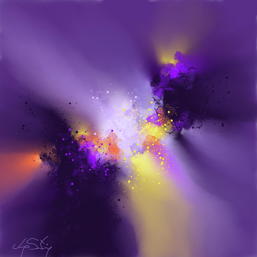 A vibrant explosion of colors blends purples, yellows, and blacks into a dynamic, swirling pattern. The energetic composition evokes a sense of celestial motion and cosmic wonder.