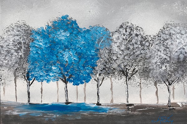 A row of trees is depicted with one tree standing out in vibrant blue, contrasting against the grayscale background of the surrounding trees. The scene evokes a sense of tranquility and visual interest with its unique color palette.